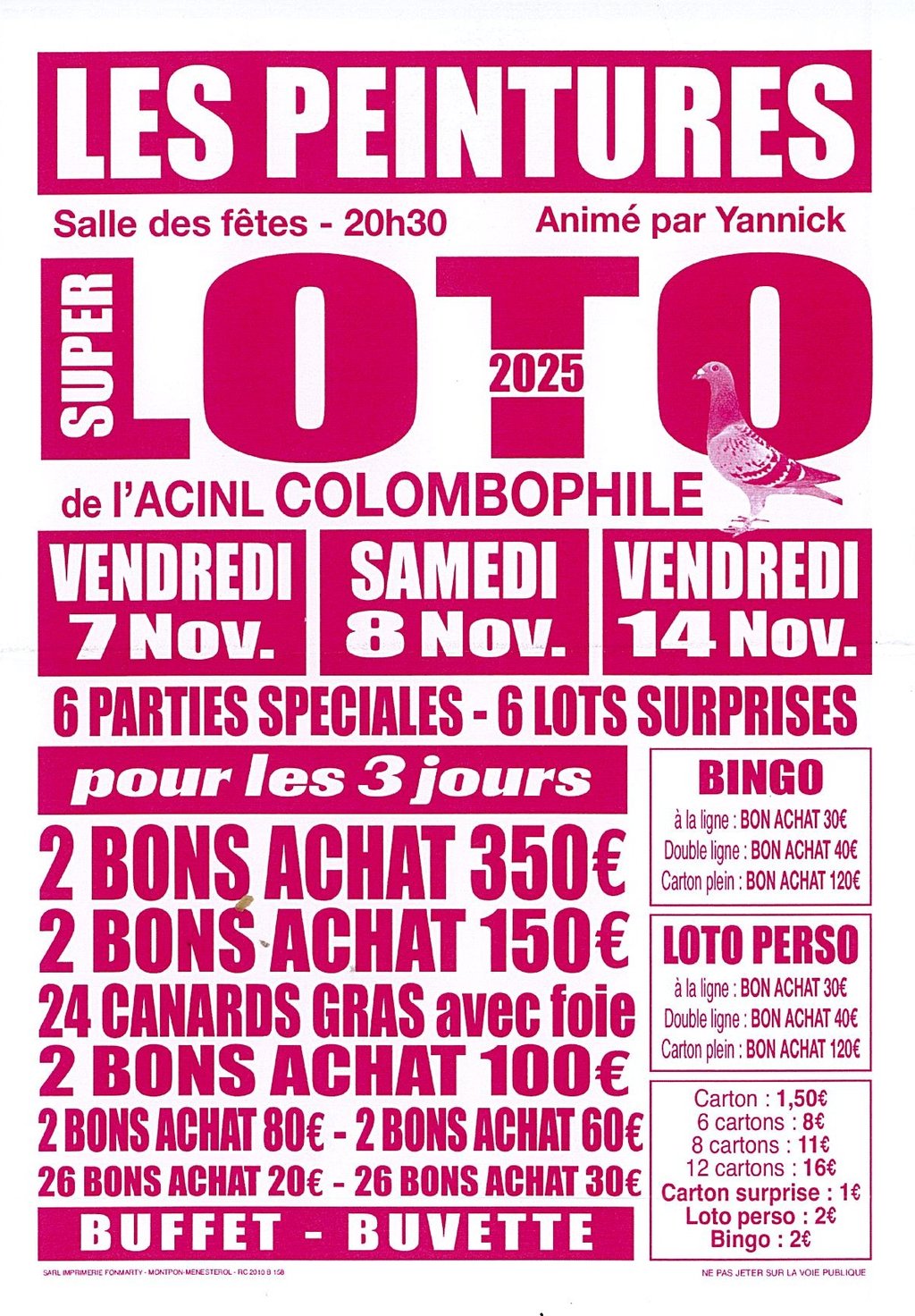 L'association ACINL COLOMBOPHILIE organise un loto le vendredi 14 novembre 2025 à la salle des fêtes de la commune.