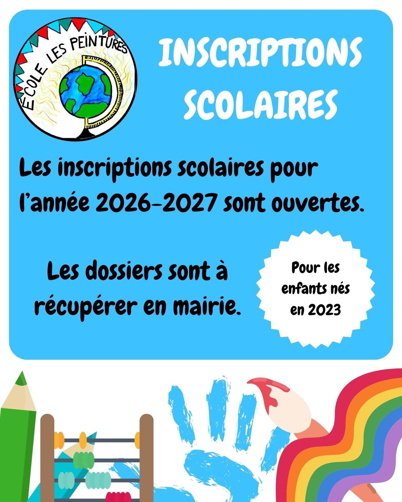 Les dossiers d'inscriptions scolaires pour l'année 2026-2027 sont disponibles au secrétariat de la mairie.