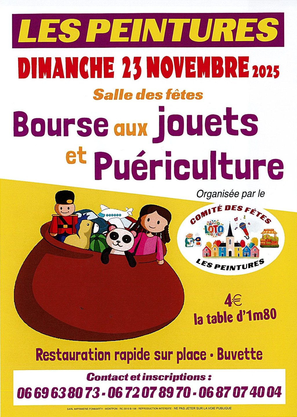 Le Comité des fêtes organise une bourse aux jouets le dimanche 23 novembre 2025 à la salle des fêtes de Les Peintures.